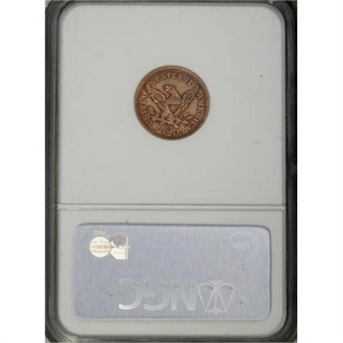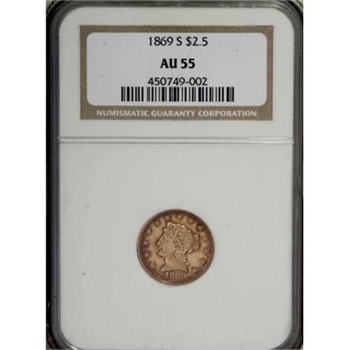 <B>1869-S $2 1/2 AU55 NGC.</B></I> Deep reddish-gold elements visit the margins of this otherwise orange-gold Choice AU example. Well-defined for the issue and a still-lustrous survivor from a mintage of just 29,500 pieces.<BR><BR><B>Coin Engraver:</B> Christian Gobrecht<BR><BR><b>Shipping:</b> Coins & Currency (<a target="_blank" href="http://www.heritageauctions.com/common/shipping.php">view shipping information</a>)