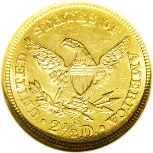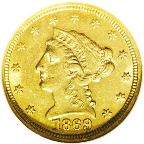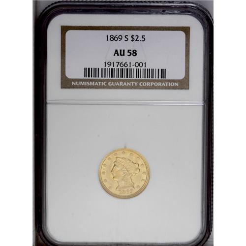 <B>1869-S<$2 1/2> AU58 NGC.</B></I> A typical example with considerable frosty luster and light yellow color. Although the mintage was quite a bit higher than similarly dated Philadelphia Mint coins, nearly all of these San Francisco pieces entered circulation, and few have survived in top grades. There were only a few collectors on the West Coast to save examples, and East Coast collectors didn't care about branch mint issues. Census: 49 in 58, 16 finer (7/06).