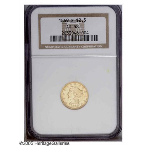 1869-S $2 1/2 AU58 NGC. The ''69-S, with a mintage of 1869-S[$2 1/2] AU58 NGC.