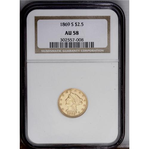 1869-S $2 1/2 AU58 NGC. The ''69-S, with a mintage of