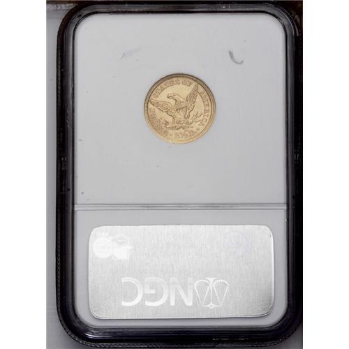 <B>1869-S $2 1/2 AU58 NGC.</B></I> The '69-S, with a mintage of 29,500 pieces, is a scarce issue in all grades. The high-end AU example presented here displays peach-gold surfaces that retain considerable luster. Typical softness is noted on some of Liberty's hair curls and the eagle's leg feathers. A few miniscule ticks scattered about do not distract in the least. Great overall eye appeal. Census: 46 in 58, 15 finer (12/05).