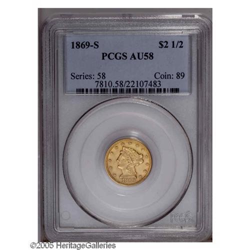 1869-S $2 1/2 AU58 PCGS. The ''69-S, with a mintage of 1869-S[$2 1/2] AU58 PCGS.
