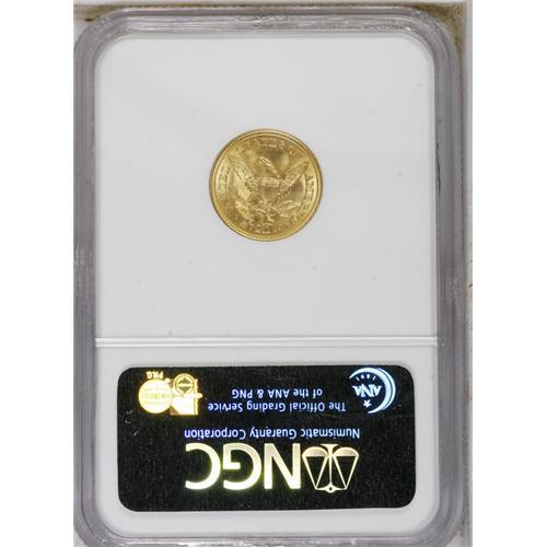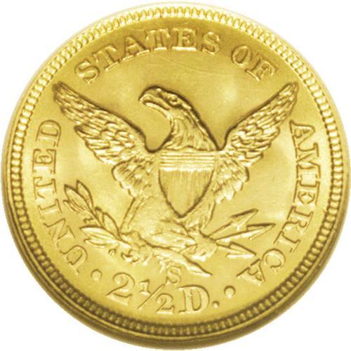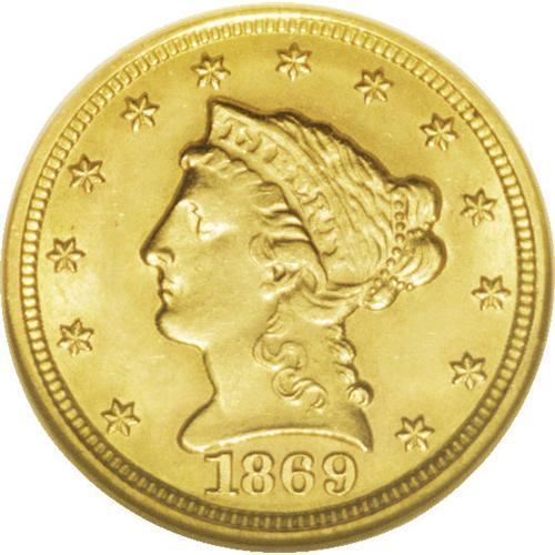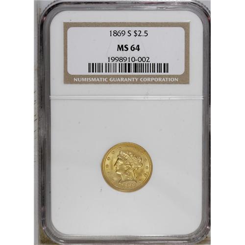 <B>1869-S $2 1/2 MS64 NGC.</B></I> This is a somewhat scarcer S-mint issue, with a mintage of just 29,500 pieces. Akers observed that this date is one of the most poorly struck of all San Francisco quarter eagles. He observed that examples of this issue are difficult for non-specialists to grade, due to its typically soft highpoint details.<BR> This near-Gem is conditionally scarce, and is one of only five '69-S quarter eagles to be certified at MS64 by the two major grading services. Just one Gem has been encapsulated at NGC, and two Premium Gems have been identified as such by PCGS (10/06). Rich luster and pleasing orange-peach coloration are observed on both sides. A few wispy marks are noted in the fields. A desirable and highly attractive example of this challenging date.<BR><BR><b>Shipping:</b> Coin/Currency (<a target="_blank" href="http://www.heritageauctions.com/common/shipping.php">view shipping information</a>)