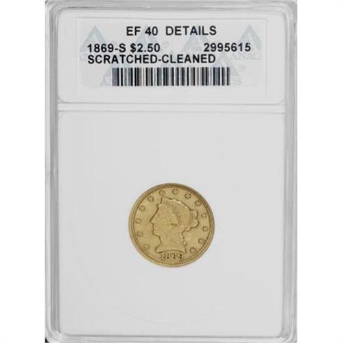 <B>1869-S $2 1/2 --Cleaned, Scratched--ANACS. XF40 Details.</B></I> NGC Census: (8/151). PCGS Population (13/76). Mintage: 29,500. Numismedia Wsl. Price for NGC/PCGS coin in XF40: $480. (#7810)<BR><BR><B>Coin Engraver:</B> Christian Gobrecht<BR><BR><b>Shipping:</b> Coins & Currency (<a target="_blank" href="http://www.heritageauctions.com/common/shipping.php">view shipping information</a>\)