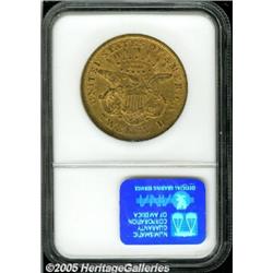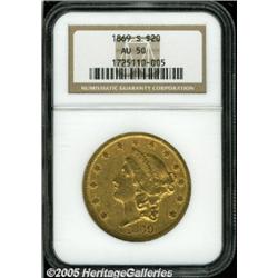 <B>1869-S $20 AU50 NGC.</B></I> A scarcer Type Two double eagle. Flatly struck on the stars, as usual, there is good luster remaining, and a few moderate abrasions contribute to the scuffy overall appearance of the piece.