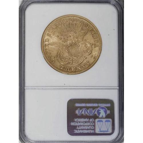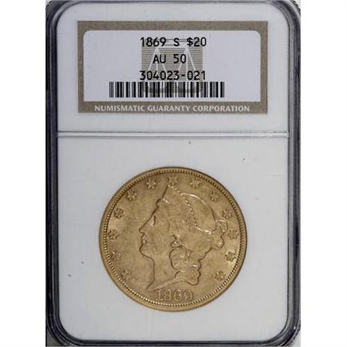<B>1869-S $20 AU50 NGC.</B></I> This is a plentiful date in VF and XF grades, but scarce in higher grades. The mintage was quite substantial, but like other issues of the San Francisco Mint, nearly all of them entered circulation. This example is clearly abraded like most, but it has excellent luster and good eye appeal.<BR><BR><b>Shipping:</b> Coins & Currency (<a target="_blank" href="http://www.heritageauctions.com/common/shipping.php">view shipping information</a>)