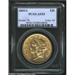 1869-S $20 AU53 PCGS. A few of the stars are softly struck, but the central devices are bold. The ab
