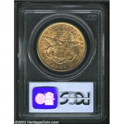 1869-S $20 AU53 PCGS. A few of the stars are softly struck, but the central devices are bold. The abundant bright mint luster adds to the eye appeal, while the surfaces are refreshingly free from heavy contact marks. Important notice: We expect to be auctioning lots at the rate of 200-250 per hour. Sometimes eBay Premier live bid software cannot keep up with that pace, so we strongly recommend that you place a realistic proxy bid now as insurance to avoid disappointment. Also please note that all Heritage/CAA lots purchased through eBay Premier carry a 20% Buyer's Premium. Please make sure you read the Terms and Conditions.