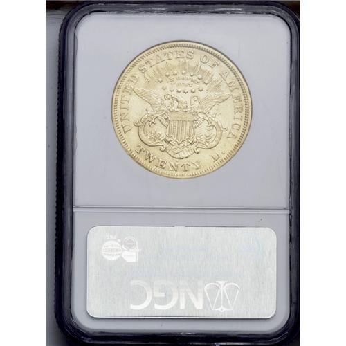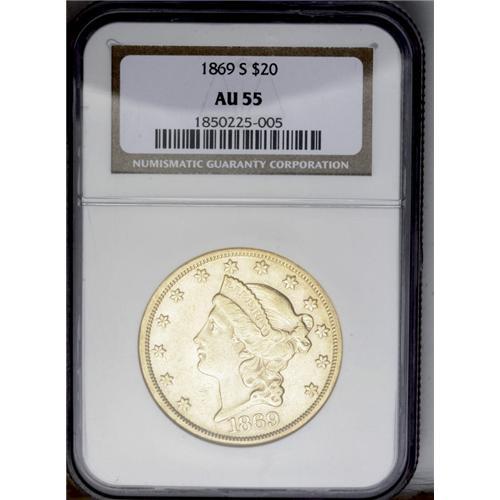 <B>1869-S<$20> AU55 NGC.</B></I> A few of the stars are softly struck, otherwise the strike is nice for the issue, the surfaces only minimally abraded with considerable remaining luster.