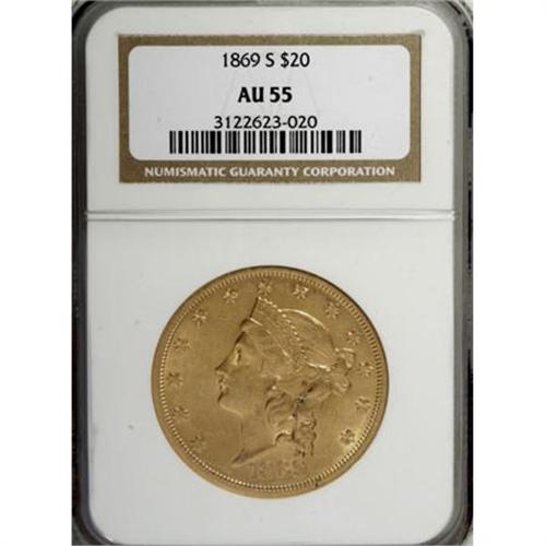 <B>1869-S $20 AU55 NGC.</B></I> Although the San Francisco Mint struck more than two thirds of a million double eagles in 1869, those coins were strictly regarded as bullion, and most were eventually melted. Only a small percentage of the production has survived with noticeable remaining luster. This nicely struck example has pleasing luster for the AU55 level, and is attractive despite concealed marks on the shield lines.<BR><BR><B>Coin Engraver:</B> James B. Longacre<BR><BR><b>Shipping:</b> Coins & Currency (<a target="_blank" href="http://www.heritageauctions.com/common/shipping.php">view shipping information</a>)