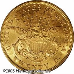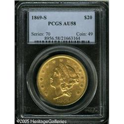 <B>1869-S $20 AU58 PCGS.</B></I> A conditionally challenging Type Two Twenty, the 1869-S was not recovered from the <I>S.S. Central America, Brother Jonathan, or Republic</B></I> shipwrecks, since it was minted after those unfortunate maritime disasters. Paper money was anathema on the west coast during this era, and despite its high face value, the 1869-S was required in commerce. Borderline Uncirculated examples are elusive. Typically marked and well struck save for a few of the obverse stars. Population: 34 in 58, 24 finer (1/05). Lot:9044