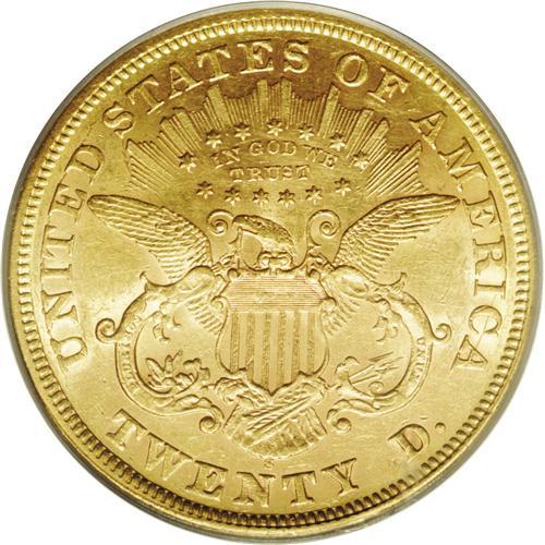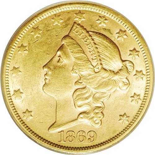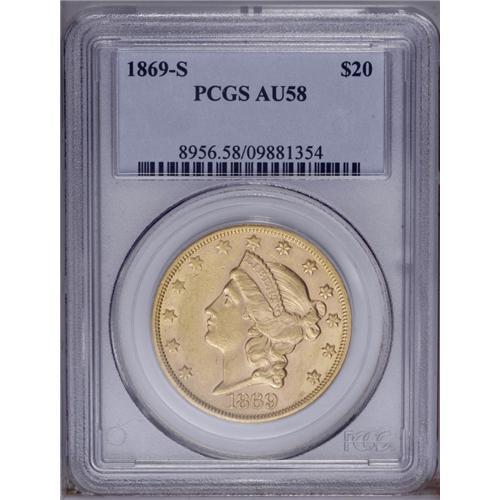 1869-S $20 AU58 PCGS. Beginning with the 1873 Open 3, 1869-S[$20] AU58 PCGS.