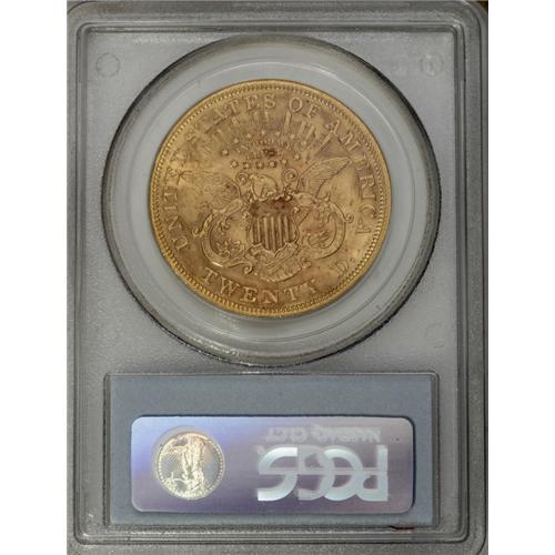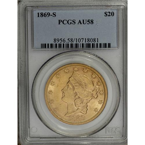 <B>1869-S $20 AU58 PCGS.</B></I> Gold coins dated between 1873 and the shipwreck hoards of 1857 to 1865 are generally unavailable in Mint State, at least in any significant quantities. The present piece is noteworthy for its mellow orange-gold coloration that deepens on the reverse to golden-brown, with excellent luster. Relatively few abrasions mar the appeal.<BR><BR><b>Shipping:</b> Coins & Currency (<a target="_blank" href="http://www.heritageauctions.com/common/shipping.php">view shipping information</a>)