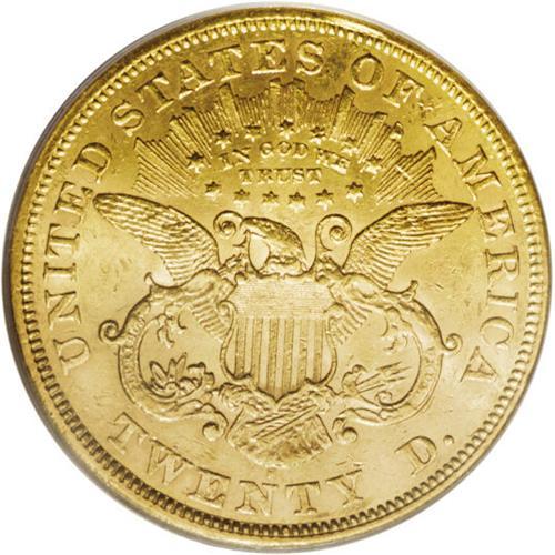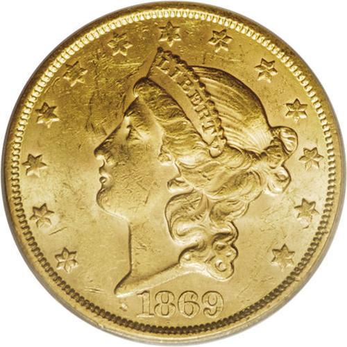 <B>1869-S $20 AU58 PCGS.</B></I> The 1869-S double eagle sported a relatively high mintage (686,750 business strikes), resulting in a plentiful supply of Very Fine and Extremely Fine coins. Mint State examples are quite rare, and high-end AU pieces, such as the one in this lot, are themselves elusive. Considerable luster adorns bright peach-gold surfaces on this example, and the design elements are well impressed. A handful of light to moderate contact marks are seen on the obverse.<BR><BR><b>Shipping:</b> Coins & Currency (<a target="_blank" href="http://www.heritageauctions.com/common/shipping.php">view shipping information</a>)