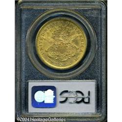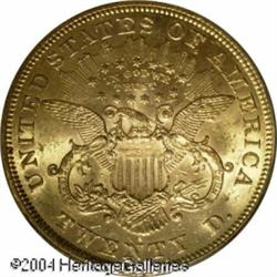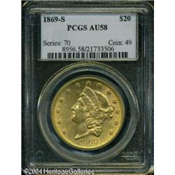 1869-S $20 AU58 PCGS. The difficulty of this scarc <B>1869-S $20 AU58 PCGS.</B></I> The difficulty of this scarcer Type Two issue increases dramatically as the condition approaches Mint State. This almost completely lustrous example displays softness on the upper left obverse stars, as normally seen, and is tinged in reddish patina. A few noticeable contact marks are seen on Liberty's cheek and in the left obverse field. <BR><BR><B>Important notice:</B> Heritage usually auctions material at the rate of 200-250 lots per hour. On some occasions eBay Live bid software or the Internet may not be able to keep up with the pace of the auction. We recommend placing a realistic absentee bid now as insurance to avoid disappointment. Occasionally the auctioneer may eliminate or reject an eBay Live bid, and the auctioneer may also reopen a lot after the close of the eBay live bidding (usually because we missed an audience bid), and may reject your bid even if it shows you as the winning bidder. By bidding via eBay Live, you agree that Heritage may award the lot to another bidder at its sole discretion under the circumstances described above or any other reasonable circumstances. Since eBay bids are not shown to us until we open the lot on the floor, we treat those bids just like floor bids. In most cases the floor responds before the eBay bid is presented to us, due to Internet lag time, so for consistency we have made it a policy that floor bids are always considered first over tie eBay live bids. Also please note that all Heritage lots purchased through eBay Live carry a 20% Buyer's Premium. Please make sure you read the Terms and Conditions before you bid. This lot is being auctioned in conjunction with a live floor auction by Heritage Galleries & Auctioneers. All final auction and invoice information will be supplied by Heritage Galleries & Auctioneers, and all other information should be considered preliminary. Lot:6867