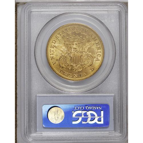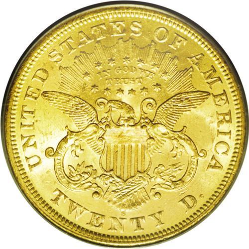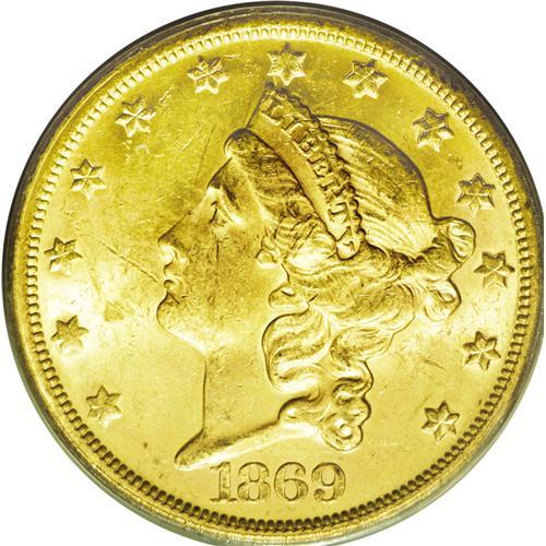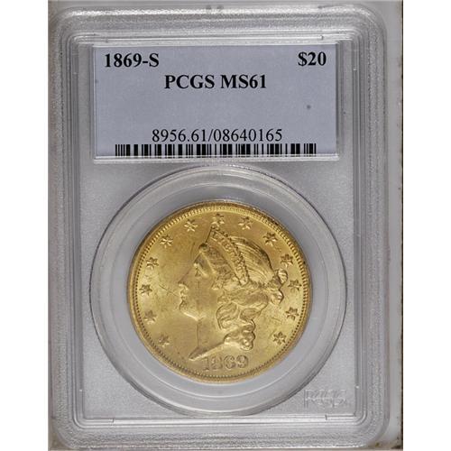 <B>1869-S<$20> MS61 PCGS.</B></I> A scarce Mint State example of this popular Type Two issue that is generally unavailable any finer than AU. The strike overall is better than usually seen, with some detailing evident on the peripheral obverse stars. The reddish-gold surfaces show good mint luster and typical marks for the grade. A deep abrasion extends from just below Liberty's mouth into the left obverse field. Population: 18 in 61, 11 finer (7/06).