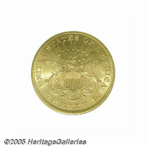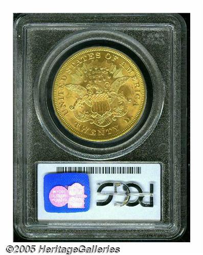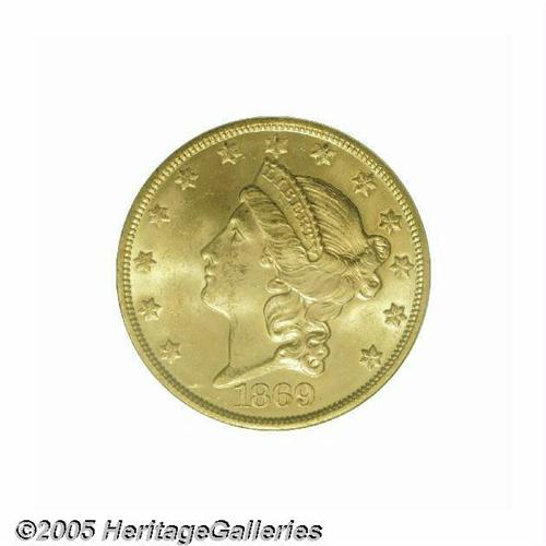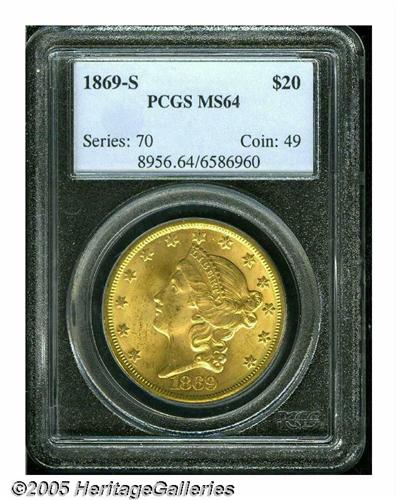 <B>1869-S<$20> MS64 PCGS.</B></I> Here is a very rare type or date coin for the collector to find in this Choice Mint State grade. The surfaces are outstanding for this issue as virtually every double eagle issued in 1869 was shipped about and are nearly always found in much lower grades or in circulated condition. Note the beauty of Liberty's cheek and the surrounding fields, which show just trivial scuffs and minute nicks, unlike the heavily bagmarked surfaces often encountered. As nearly always seen, the strike is fairly sharp, although a couple of stars lack the complete radial lines to their centers. Examination of the reverse fails to find fault, and this portion of the coin would probably grade even higher on its own. This coin is identifiable by a tiny nick crossing the lower portion of the N in TWENTY and a tiny scratch below the first obverse star. As to rarity, that is where this beauty really shines. The combined NGC and PCGS Population reports show a total of four coins graded this high, with none seen higher by either service. Obviously, this coin is a contender for the finest known of the date, and such quality is highly coveted by most serious collectors. Expect a battle for this coin when it crosses the block.<BR>The year 1869 was quite memorable when Jay Gould and James "Jubilee Jim" Fisk created quite a stir in the gold market. President Lincoln had partially financed the Northern war effort by issuing greenbacks (paper) currency. Gold had generally disappeared from circulation during the 1860s and continued in hiding well afterward, even as far west as San Francisco. As prices slowly returned to normal after the war and more coins returned to circulation Gould and Fisk decided it might be fruitful to attempt to corner the market for gold. Normally, the huge gold bullion holdings of the United States Treasury were used to keep the price of gold stable. Nevertheless speculators Gould and Fisk employed various friends and acquaintances to have President U. S. Grant hold the Treasury's gold off the market, giving them a chance to push up the price of gold. Grant was led to believe that long suffering farmers were unable to sell their home grown grain overseas as the price of gold was too low, so increasing it a bit might make local grain more competitive. Gould and Fisk bought highly leveraged positions in gold, hoping to cash in on the quick rise in the price of gold. At that time speculators could leverage about 100 to 1, in other words they could own 100 ounces of gold for every 1 ounce they purchased on paper. Naturally, just a small move in the price of gold the wrong direction would wipe out their holdings, but if they were correct, then millions could be quickly made in the market. Unsuspecting Grant cooperated for a brief time, and the highly leveraged Gould and Fisk made paper fortunes. The price of gold rose steadily into September, 1869. The Gould and Fisk scheme seemed to be working, but then President Grant found out the true motivation of his "friends" and he immediately authorized gold bullion to be sold by the Treasury. This happened on September 24, 1869, a date which became known as "Black Friday". The price of gold collapsed back to levels seen before the corner was attempted. Many gold speculators were wiped out, and Gould and Fisk had to move on to other ventures. This particular double eagle was struck during this wild year and perhaps saved as a memento by someone involved as it memorialized the famous year that Gould and Fisk nearly cornered the gold market.