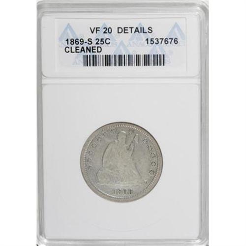 <B>1869-S 25C --Cleaned--ANACS. VF20 Details.</B></I> NGC Census: (0/15). PCGS Population (1/23). Mintage: 76,000. Numismedia Wsl. Price for NGC/PCGS coin in VF20: $245. (#5475)<BR><BR><B>Coin Engraver:</B> Christian Gobrecht<BR><BR><b>Shipping:</b> Coins & Currency (<a target="_blank" href="http://www.heritageauctions.com/common/shipping.php">view shipping information</a>\)