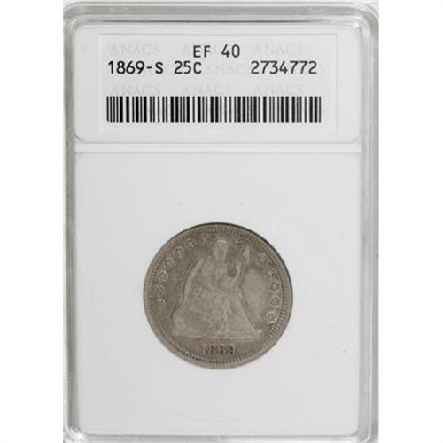 <B>1869-S 25C XF40 ANACS.</B></I> NGC Census: (2/10). PCGS Population (3/14). Mintage: 76,000. Numismedia Wsl. Price for NGC/PCGS coin in XF40: $500. (#5475)<BR><BR><B>Coin Engraver:</B> Christian Gobrecht<BR><BR><b>Shipping:</b> Coins & Currency (<a target="_blank" href="http://www.heritageauctions.com/common/shipping.php">view shipping information</a>\)