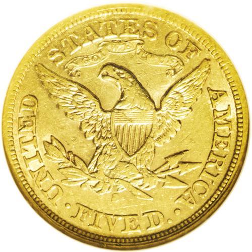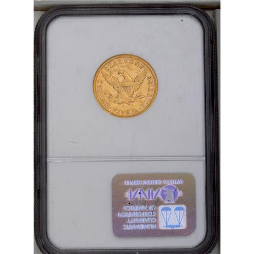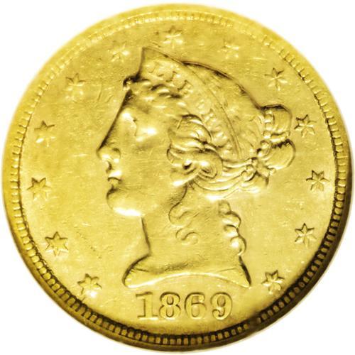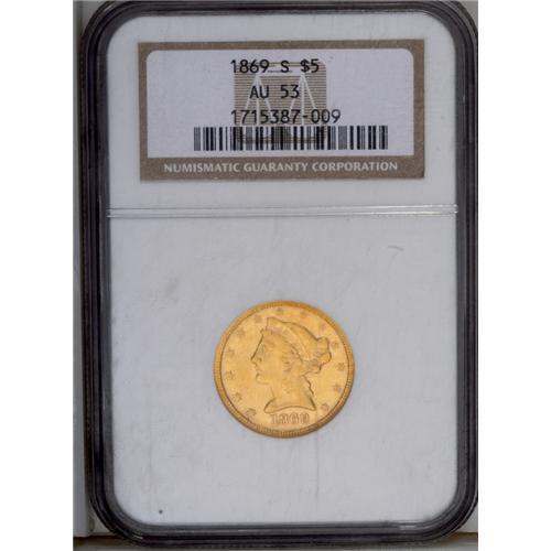 <B>1869-S<$5> AU53 NGC.</B></I> The 1869-S is scarcer than suggested by its mintage of 31,000 pieces, since the issue was struck before foreign bullion exports became commonplace. This bright yellow-gold representative has its share of small marks, but none require individual mention. Moderate softness on Liberty's curls and the eagle's neck is typical of the era. Census: 8 in 53, 20 finer (7/06).