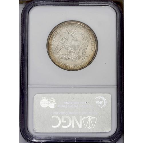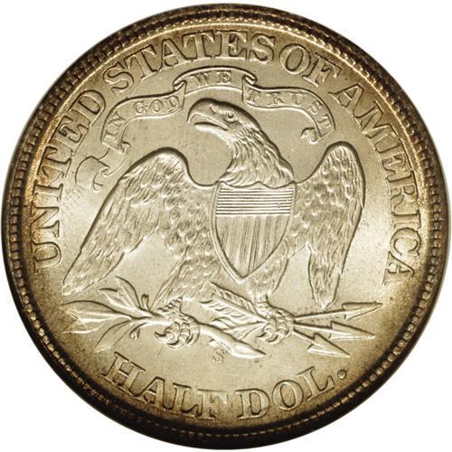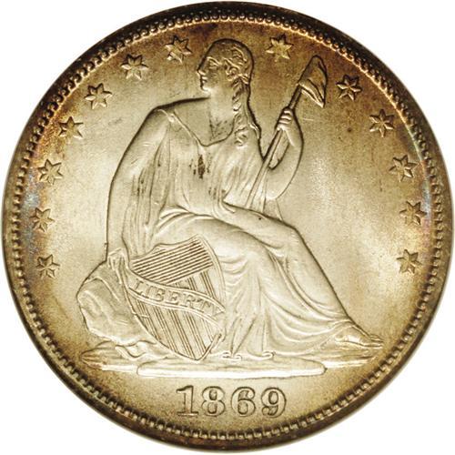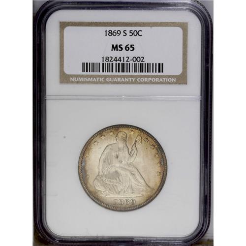 <B>1869-S<50C> MS65 NGC.</B></I> WB-101. Very Small Mintmark. The placement of the mintmark is below the crotch formed by the feather tip and the olive stem--one of two reverse dies to have the mintmark punched in this position. The highly lustrous surfaces are richly toned and the devices sharply defined throughout, save for a little bluntness at the obverse periphery. A very scarce S-mint half dollar from the 1860s. Census: 4 in 65, 7 finer (3/06). <BR><BR><B>Important notice:</B> Heritage usually auctions material at the rate of 200-250 lots per hour. On some occasions eBay Live bid software or the Internet may not be able to keep up with the pace of the auction. We recommend placing a realistic absentee bid now as insurance to avoid disappointment. Occasionally the auctioneer may eliminate or reject an eBay Live bid, and the auctioneer may also reopen a lot after the close of the eBay live bidding (usually because we missed an audience bid), and may reject your bid even if it shows you as the winning bidder. By bidding via eBay Live, you agree that Heritage may award the lot to another bidder at its sole discretion under the circumstances described above or any other reasonable circumstances. Since eBay bids are not shown to us until we open the lot on the floor, we treat those bids just like floor bids. In most cases the floor responds before the eBay bid is presented to us, due to Internet lag time, so for consistency we have made it a policy that floor bids are always considered first over tie eBay live bids. Also please note that all Heritage lots purchased through eBay Live carry a 20% Buyer's Premium. Please make sure you read the Terms and Conditions before you bid. This lot is being auctioned in conjunction with a live floor auction by Heritage Galleries & Auctioneers. All final auction and invoice information will be supplied by Heritage Galleries & Auctioneers, and all other information should be considered preliminary. Lot:2015 <BR><BR><B>Winning Notification and Billing:</B> After the FINAL session in this auction is complete, Heritage will send e-mail and snail mail invoices. This process normally takes several days. All final auction and invoice information will be supplied by Heritage Galleries & Auctioneers, and all other information should be considered preliminary. <BR><BR>This auction will be conducted on a live auction floor and over the Internet through eBay Live. If you choose to place an absentee bid, please take a moment to <font color='#0000ff'><u><a href='http://pages.ebay.com/liveauctions/help/before/laabsentee.html'>learn how eBay Live absentee bidding works</a></u></font><font color='#000000'>