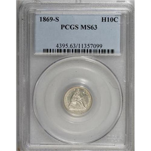 <B>1869-S H10C MS63 PCGS.</B></I> PCGS Population (7/13). NGC Census: (6/23). Mintage: 230,000. Numismedia Wsl. Price for NGC/PCGS coin in MS63: $600. (#4395)<BR><BR><B>Coin Engraver:</B> Christian Gobrecht<BR><BR><b>Shipping:</b> Coins & Currency (<a target="_blank" href="http://www.heritageauctions.com/common/shipping.php">view shipping information</a>)
