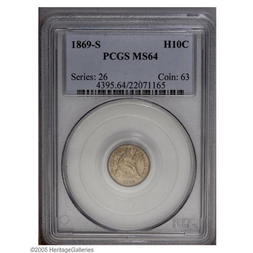 <B>1869-S<H10C> MS64 PCGS.</B></I> Variegated golden color lies atop the surfaces and the Gem level is precluded by noticeable softness at the top of the wreath on the reverse. Only one coin has been determined to be finer by PCGS.