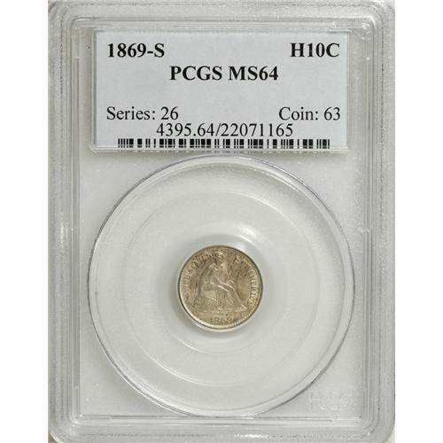 <B>1869-S H10C MS64 PCGS.</B></I> Variegated golden color with pink accents graces the softly lustrous surfaces of this appealing late-date representative. Minimally marked for the grade, though Liberty's rock and the upper wreath display a degree of softness. Population: 9 in 64, 3 finer (3/07).<BR><BR><b>Shipping:</b> Coins & Currency (<a target="_blank" href="http://www.heritageauctions.com/common/shipping.php">view shipping information</a>)