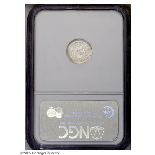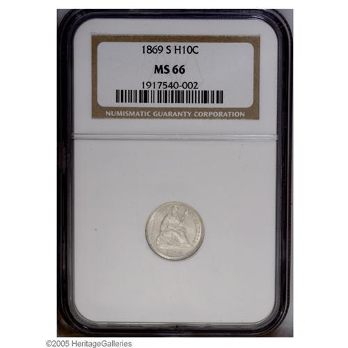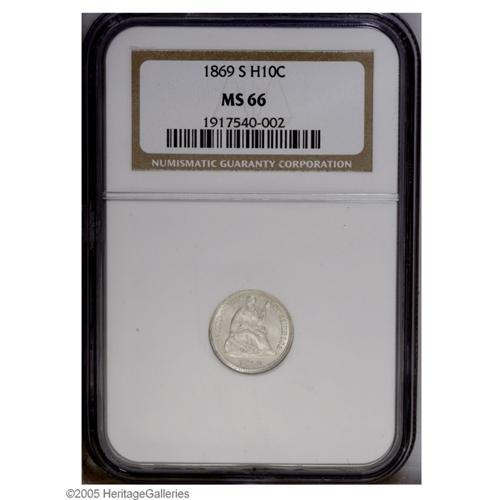 <B>1869-S<H10C> MS66 NGC.</B></I> This essentially brilliant premium Gem is thoroughly lustrous, and the preservation is exemplary. Some softness of strike is noted on the upper left portion of the wreath, not uncommon for the type. The 1869-S is rare in Mint State, and it has been several years since an example appeared in a Heritage auction in Gem or higher grades. Drapery near the base of the pole is absent, as made from exuberant die polishing at the mint. Population: 5 in 66, 2 finer (9/05).