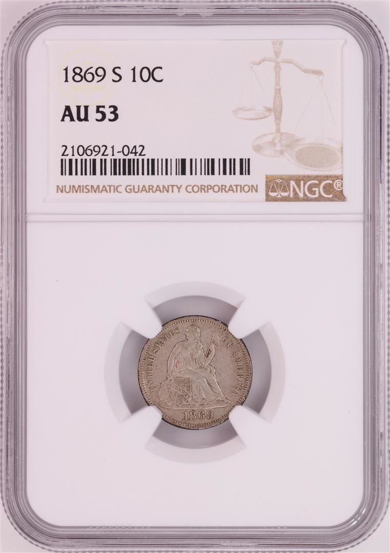 One 1869-S Seated Liberty Dime Coin NGC AU53. NGC Certified.