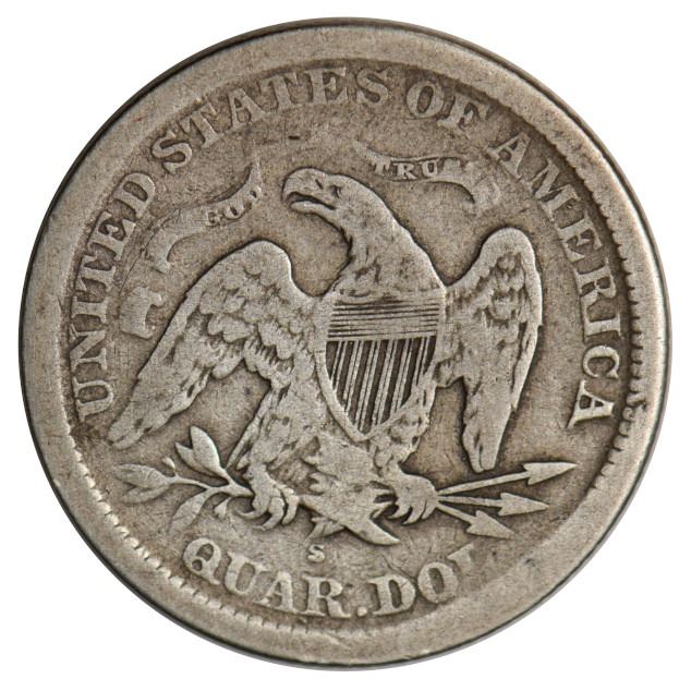 One 1869-S Seated Liberty Quarter Coin.