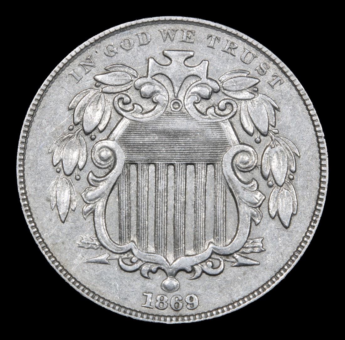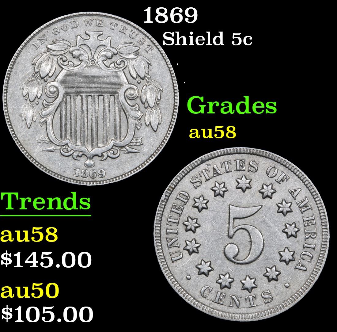 1869 . . Shield Nickel 5c Grades Choice AU/BU Slider.