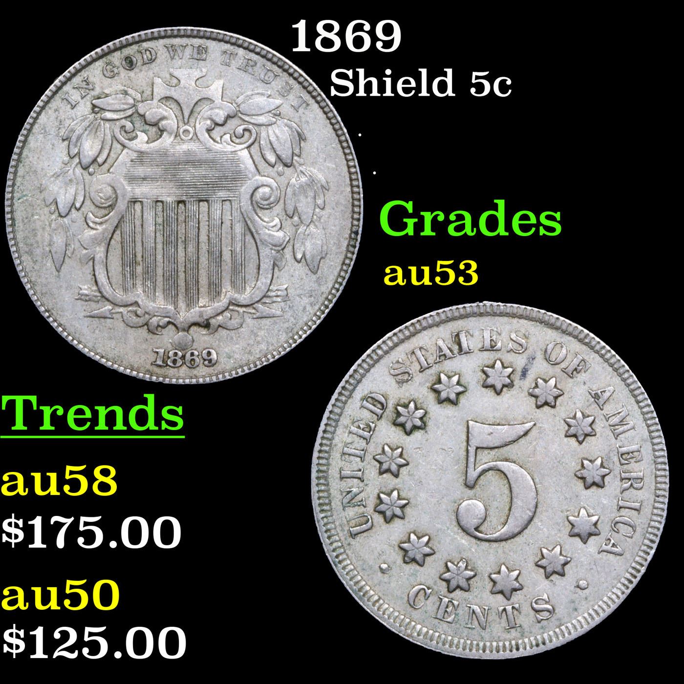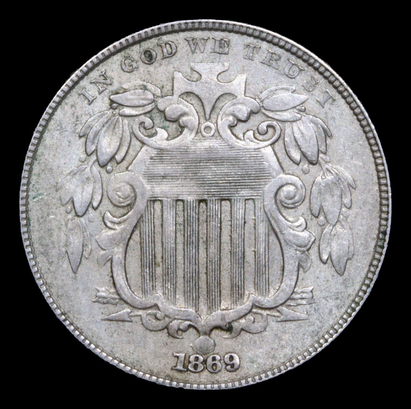 1869 Shield Nickel 5c Grades Select AU.