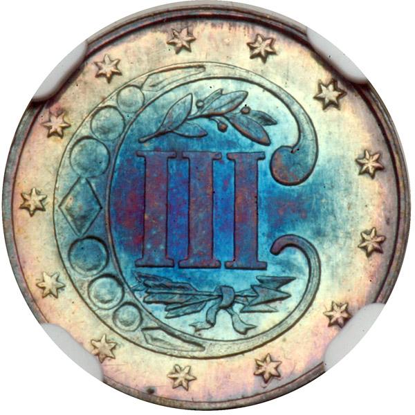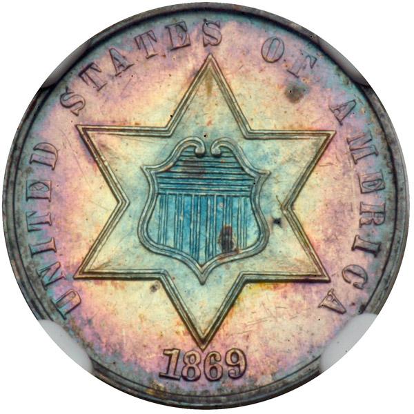 1869. NGC graded Proof 61. Dramatic multi-color toning on both sides. Only 600 struck.