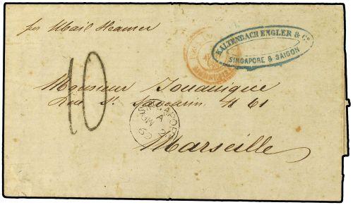 1869 Stampless envelope to FRANCE cancelled by SINGAPORE datestamp with oval firms cachet ALTENBACH ENGLER & Co SINGAPORE & SAIGON in blue, sent on mail steamer with Frech entry cachet in red and taxed "10" on arrival with MARSEILLE arrival. Superb item.