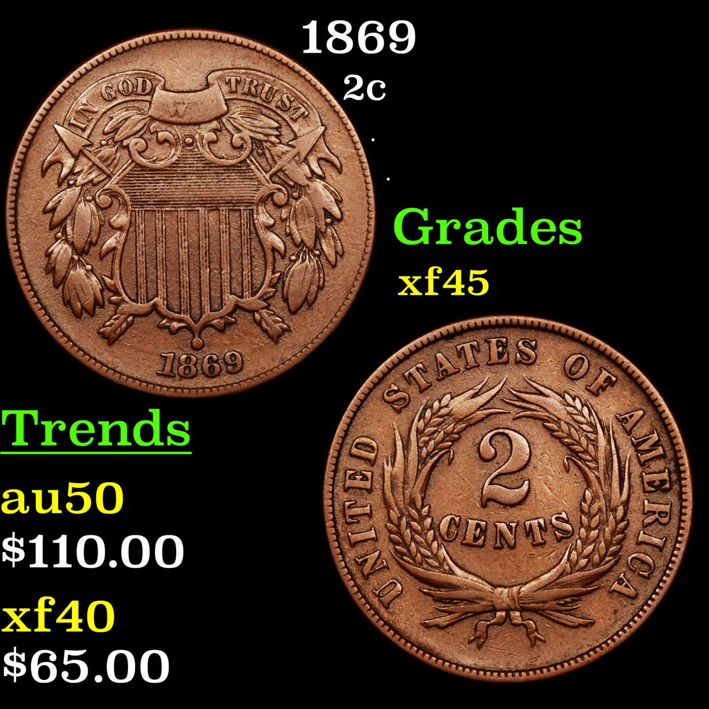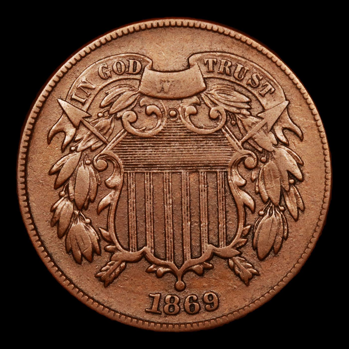 1869 Two Cent Piece 2c Grades xf+.