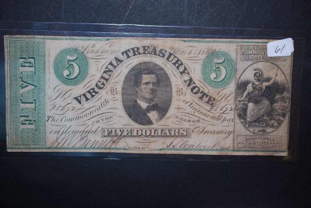 1869 US Virginia Treasury Note $5; EST. $45-55