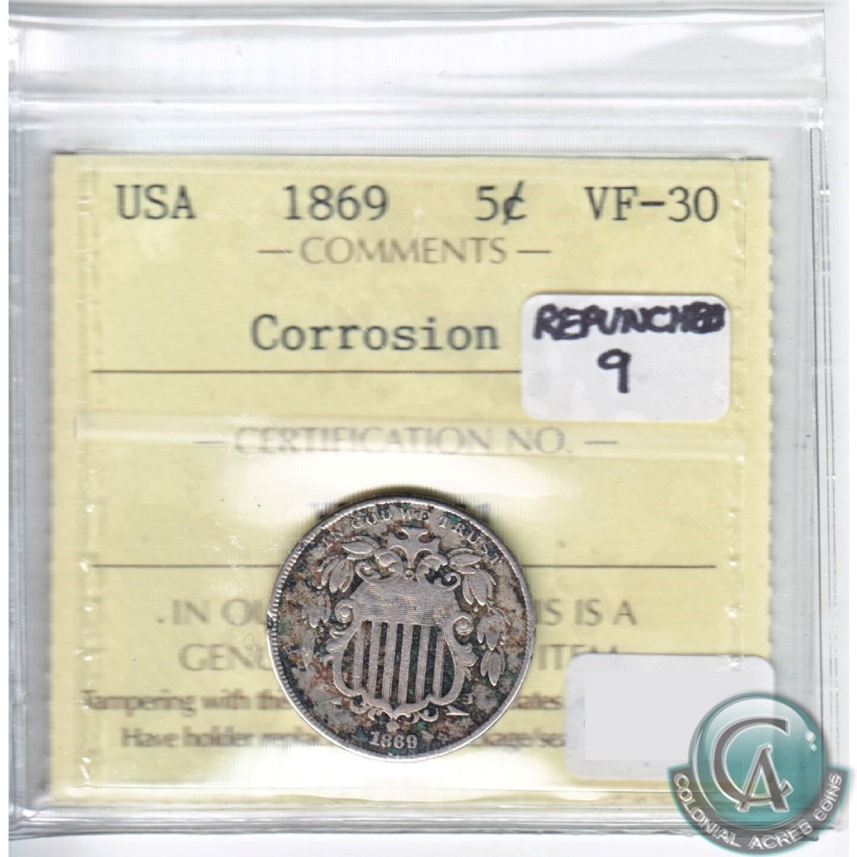 1869 USA Nickel Repunched 9 Variety ICCS Certified VF-30 (corrosion)