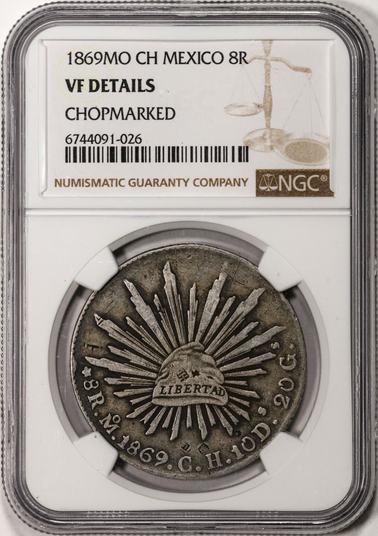 One 1869MO CH Mexico 8 Reales Silver Coin NGC VF Details Chopmarked. NGC Certified.