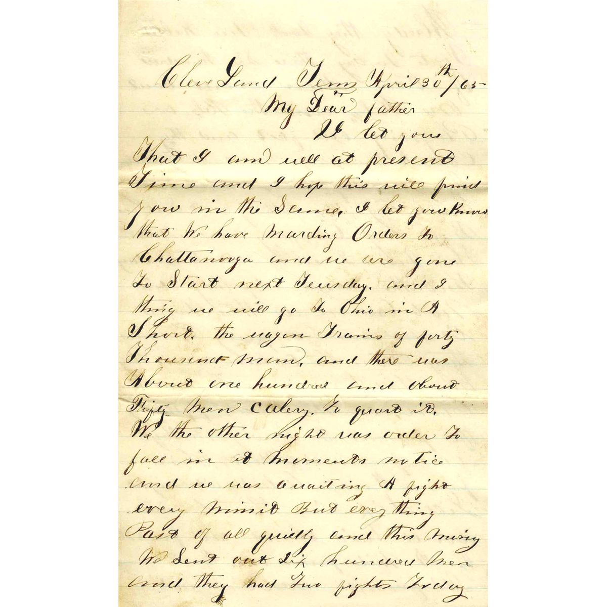 4pp. letter from Alfred Gruber of the 186th Ohio Infantry, Company C. Written in ink and datelined ''Cleveland Tenn April 30th /65 [possibly misdated],'' letter reads in part: ''…We the other night was ordered to fall in it at moments notice and we was awaiting a fight every minit but every thing past of all quietly and this morning we sent out six hundred men an they had two fights today Alredy they took two rebel forts to day there six hundred of our men and bout one rebs and the rebs are playing out fast and they fall a company most every day of our regt to go out scouting and they it with great success but my company wasn't called this time I was out three days but the reason they did not call on s this time is we are company C and they bare the caller and they keep that company as long as they can on the twenty fifth of this present the new york regt was in battle line from twelve oclock at night till six in the morning and laid about one fourth of a mile from us but we found out that it was only about four hundred rebel cavalry and I guess the fighting is pretty near over…'' During its one year service, the 186th Ohio mainly served guard duty in Tennessee. Alfred Gruber mustered into Company C on 26 February 1865 and died of disease on 9 August 1865 at Nashville. Letter measures 5'' x 8''. Light soiling to rear leaf, otherwise fine condition.