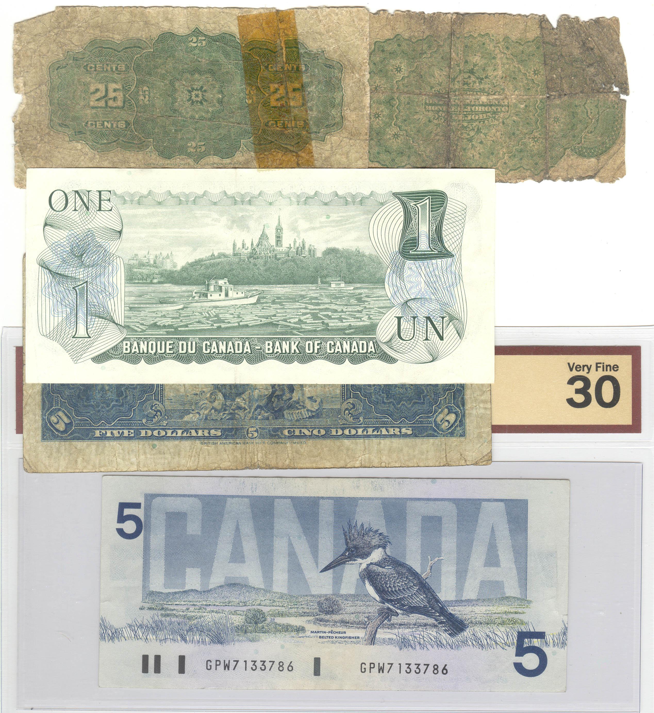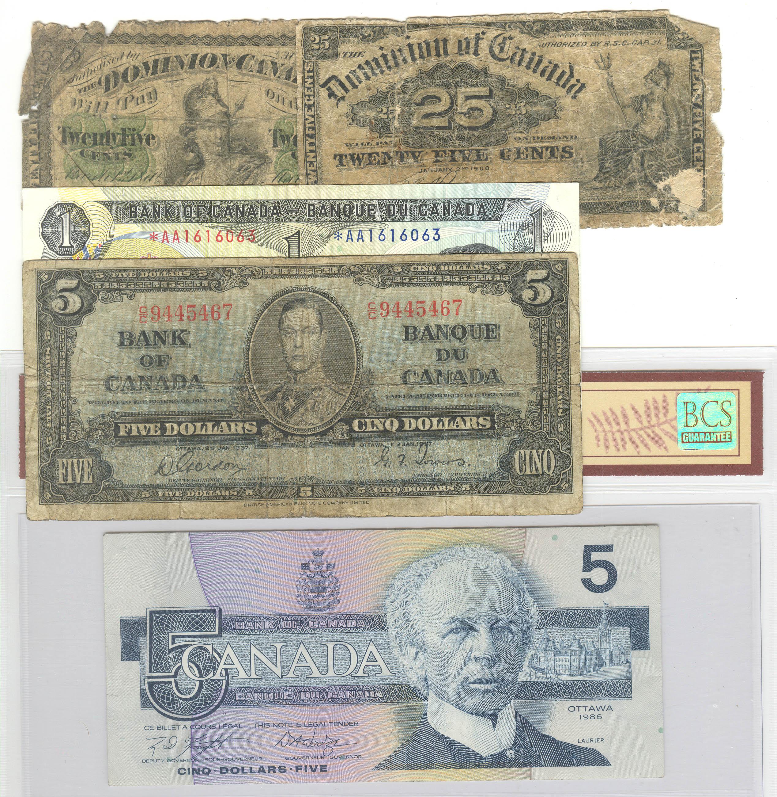 1870 Twenty Five Cents Plain, DC-1a Good, 1900 Twenty Five Cents, DC-15b, Good Repaired, 1937 Five Dollars, BC-23b, VG, 1973 One Dollars Replacement, BC-46aA, EF, Below 2,4M & 1986 Five Dollars Changeover, BC-56e, BCS VF-30. Lot of 5 notes
