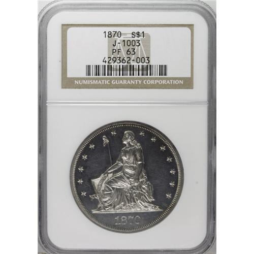 <B>1870 $1 Barber's Seated Liberty Dollar, Judd-1003, Pollock-1135, Low R.7, PR63 NGC.</B></I> William Barber's Seated Liberty design as more fully described at Judd-816. The reverse is from the regular-issue Seated Liberty dollar. Struck in silver with a plain edge. Although a few light hairlines limit the grade of this piece, it is an appealing proof with deeply mirrored fields and lustrous devices. Both sides have pale gold toning with a few freckles of darker color on the reverse.<BR><I>From The Jones Beach Collection.</B></I><BR><BR><b>Shipping:</b> Coin/Currency (<a target="_blank" href="http://www.heritageauctions.com/common/shipping.php">view shipping information</a>)