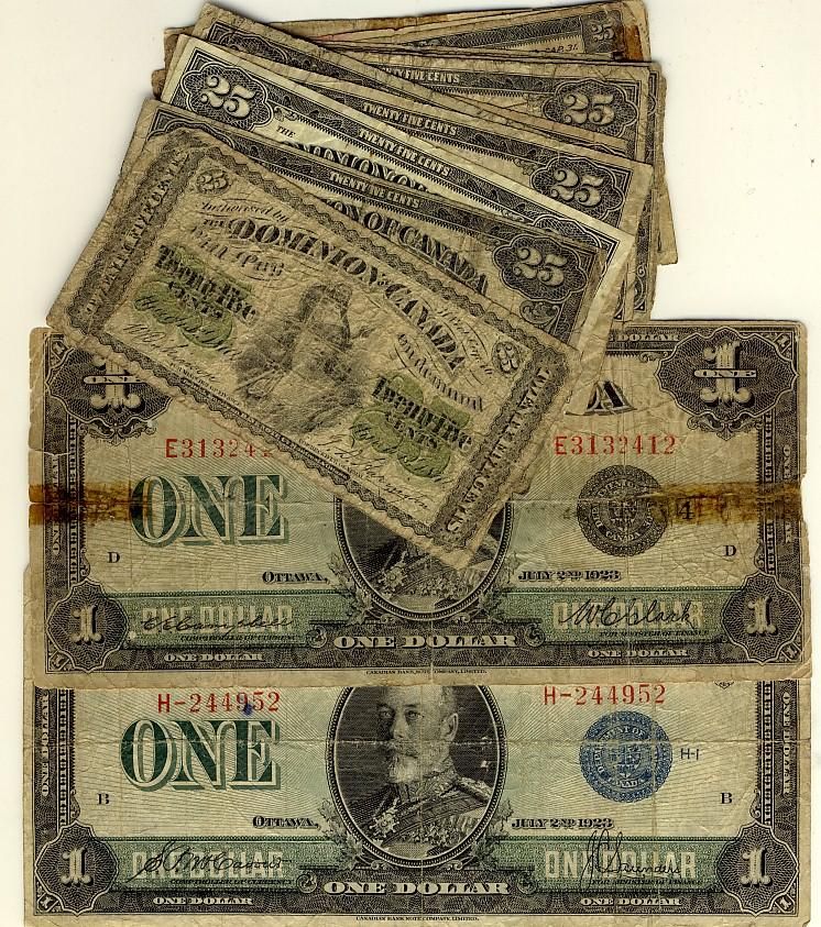 1870(1) DC-1c, 1900(5) & 1923(7) 25¢ Shinplasters and 1923 $1 DC-25c Fine and DC-25o Good.