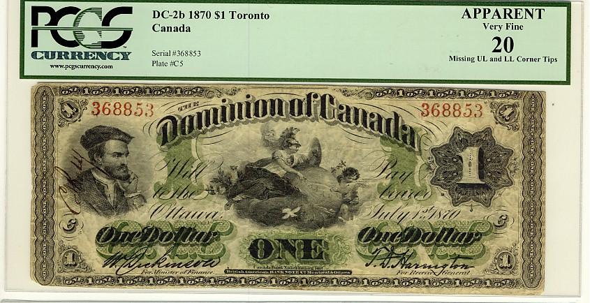 1870 $1 DC-2b #368853, PCGS VF20. Missing upper left and lower left corner tips. Rare grade.