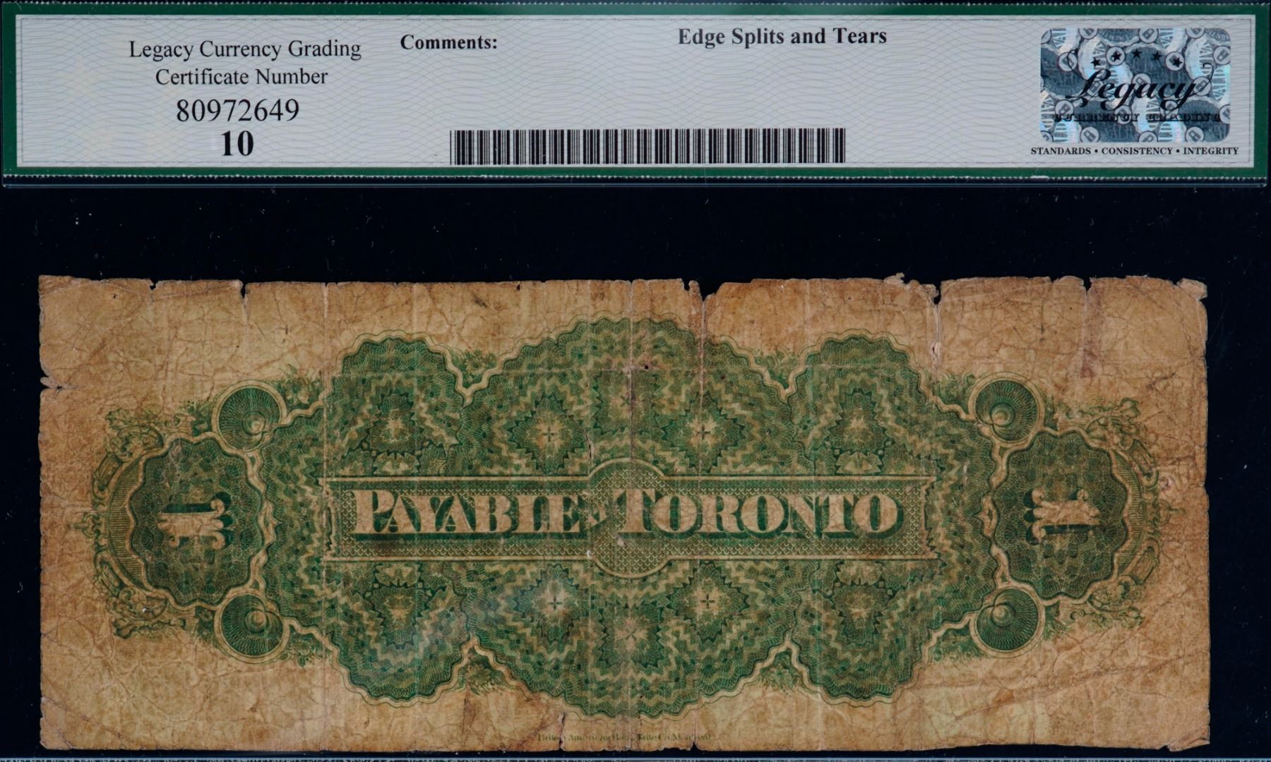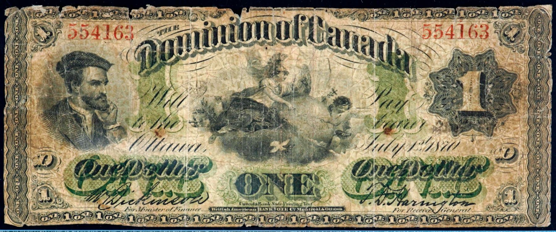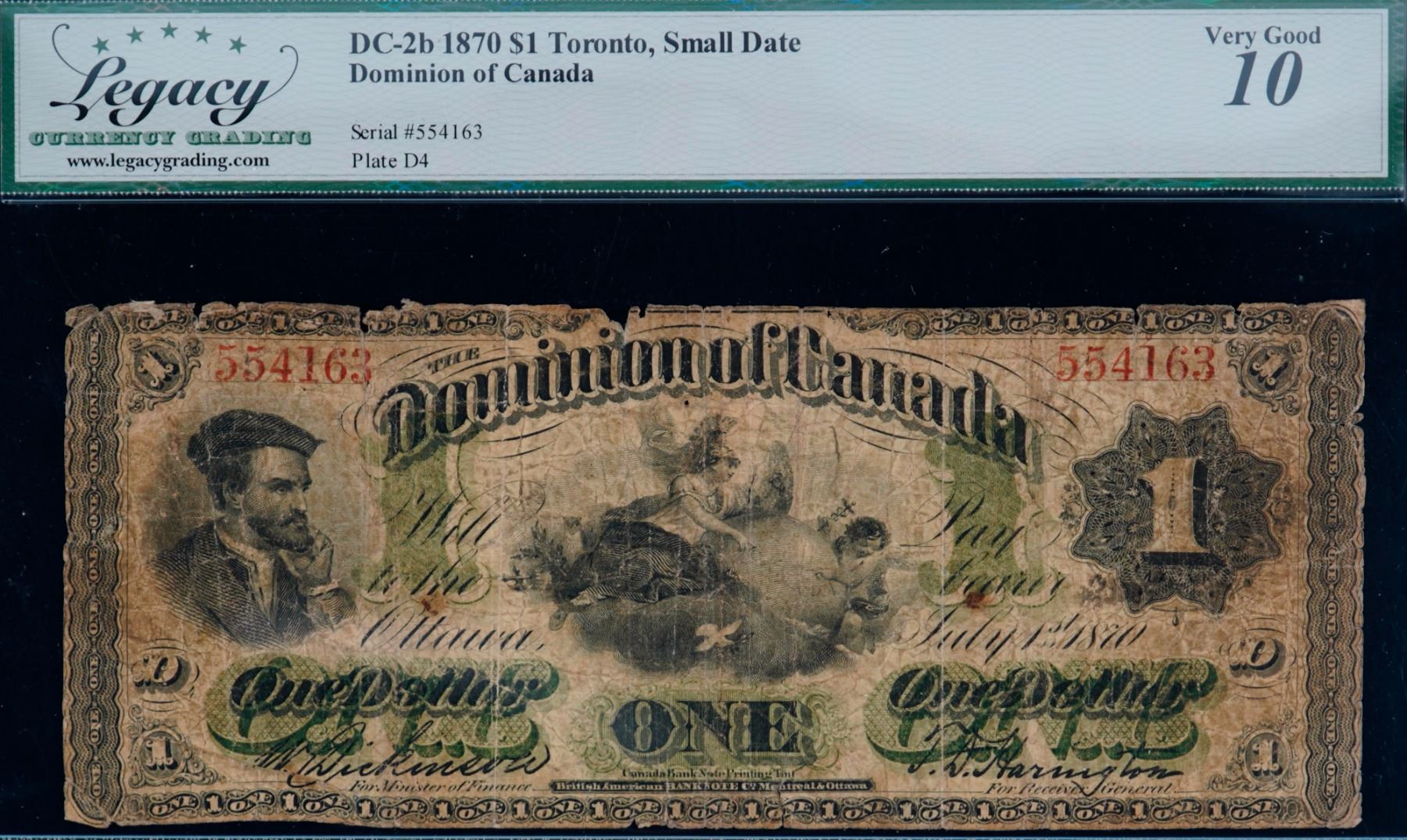 1870 $1 DC-2b #554163 "Payable at Toronto - Small date" Legacy VG10 with usual border issues.