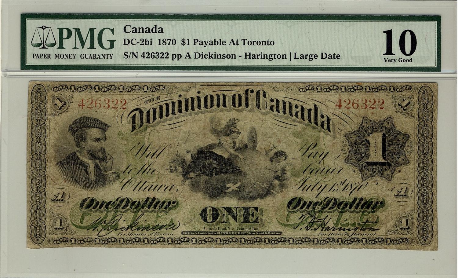 1870 $1 DC-2b-i #426322 Payable at Toronto PMG VG10. A solid VG10 example that should be viewed.