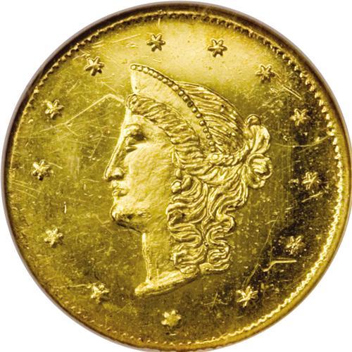 <B>1870 $1 Goofy Head Round 1 Dollar, BG-1205, High R.4, MS64 Prooflike NGC.</B></I> The popular Goofy Head type with a prominent jaw and an elongated profile. A flashy piece with deeper golden tints near the rims. The obverse field is abraded, while the reverse is well preserved.<BR><BR><b>Shipping:</b> Coins & Currency (<a target="_blank" href="http://www.heritageauctions.com/common/shipping.php">view shipping information</a>)
