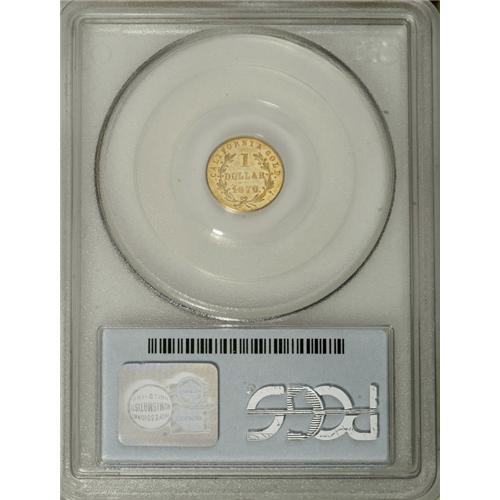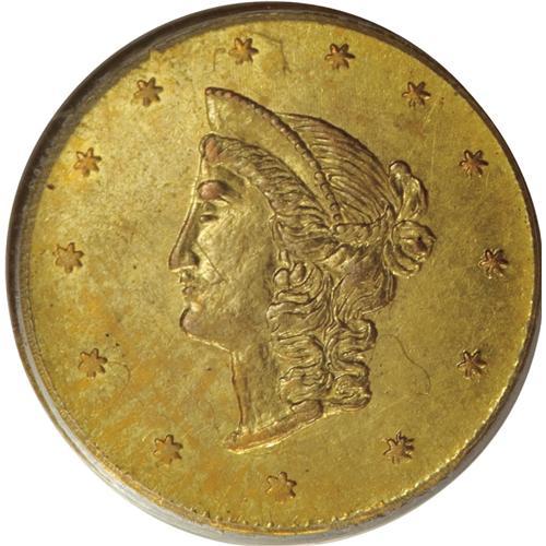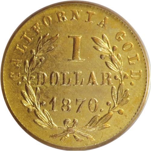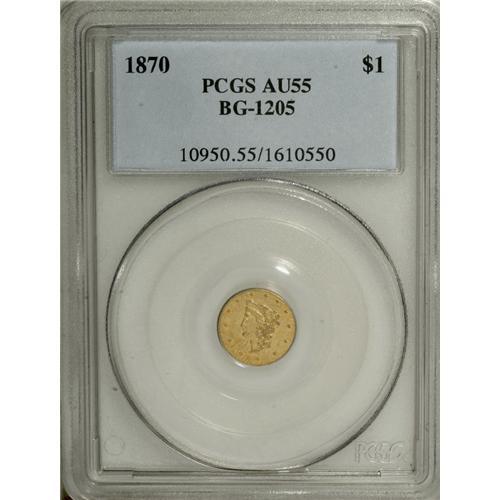 <B>1870 $1 Goofy Head Round 1 Dollar, BG-1205, High R.4, AU55 PCGS.</B></I> The "Goofy Head" late Period Two varieties are distinctive due to their crude portraits. Their maker is unknown. This green-gold representative has ample remaining luster and a couple of curly lintmarks (as made) near the bust truncation.<BR><BR><b>Shipping:</b> Coins & Currency (<a target="_blank" href="http://www.heritageauctions.com/common/shipping.php">view shipping information</a>)