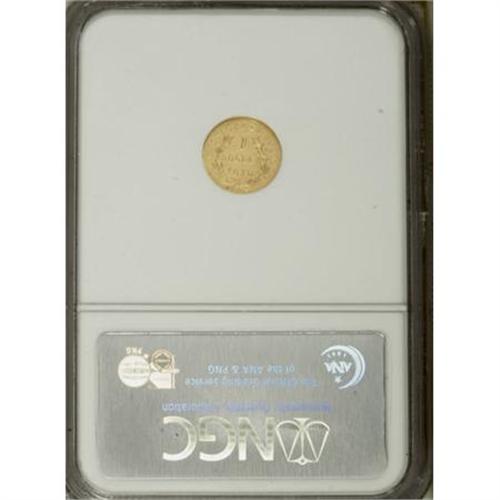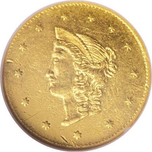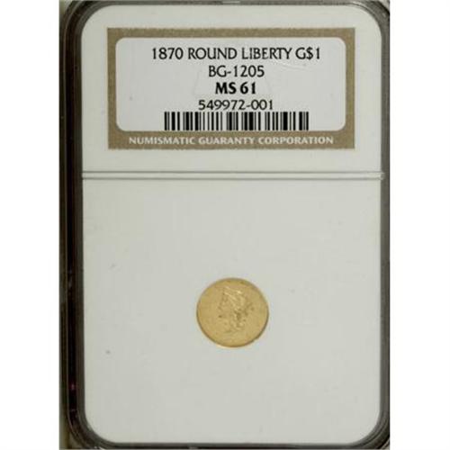 <B>1870 $1 Goofy Head Round 1 Dollar, BG-1205, High R.4, MS61 NGC.</B></I> Unlike either the more traditional Indian or Liberty motifs, this Period Two design of unknown origin has proven to be popular with collectors of fractional gold. While rather extensively abraded, this bright yellow-gold example is uniformly sharp and maintains its prooflike sparkle.<BR><BR><b>Shipping:</b> Coins & Currency (<a target="_blank" href="http://www.heritageauctions.com/common/shipping.php">view shipping information</a>)