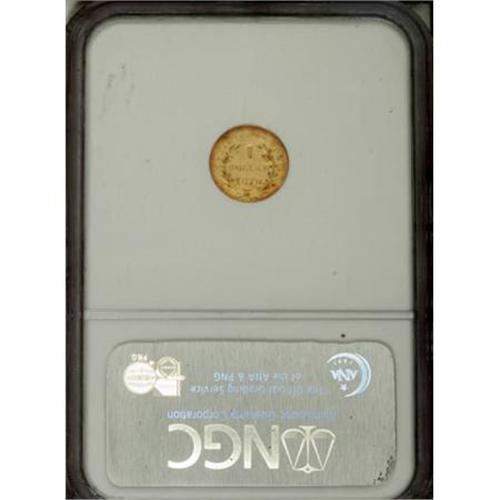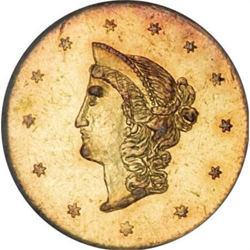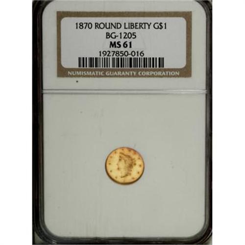 <B>1870 $1 Goofy Head Round 1 Dollar, BG-1205, High R.4, MS61 NGC.</B></I> The popular Goofy Head (or "lantern-jawed") variety. Generally nicely struck, with bright orange-gold surfaces imbued with traces of light green. Some light abrasions over each side limit the grade. Difficult to obtain in Uncirculated grades. Census: 2 in 61, 3 finer (12/07).<BR><BR><b>Shipping:</b> Coins & Currency (<a target="_blank" href="http://www.heritageauctions.com/common/shipping.php">view shipping information</a>)